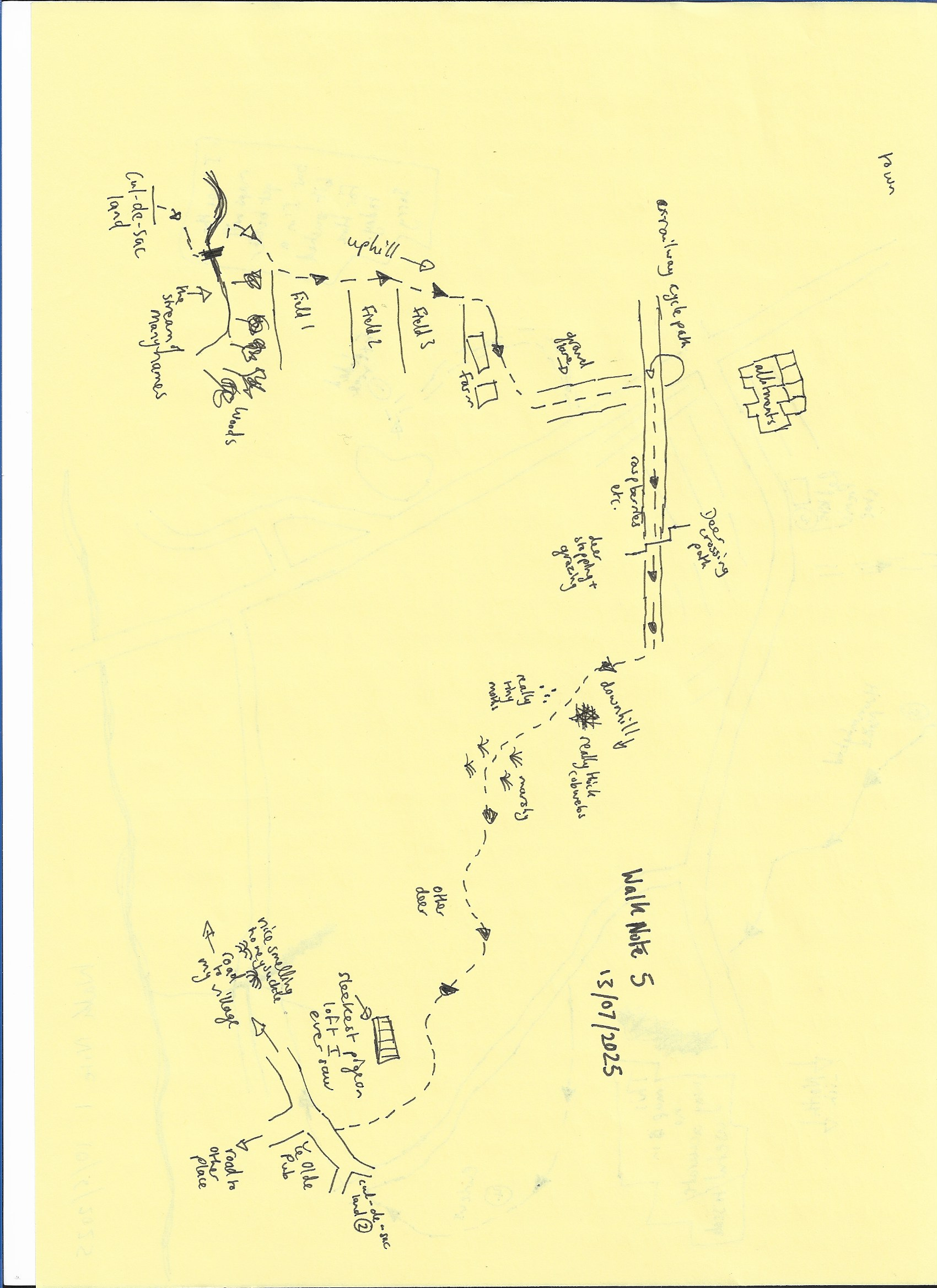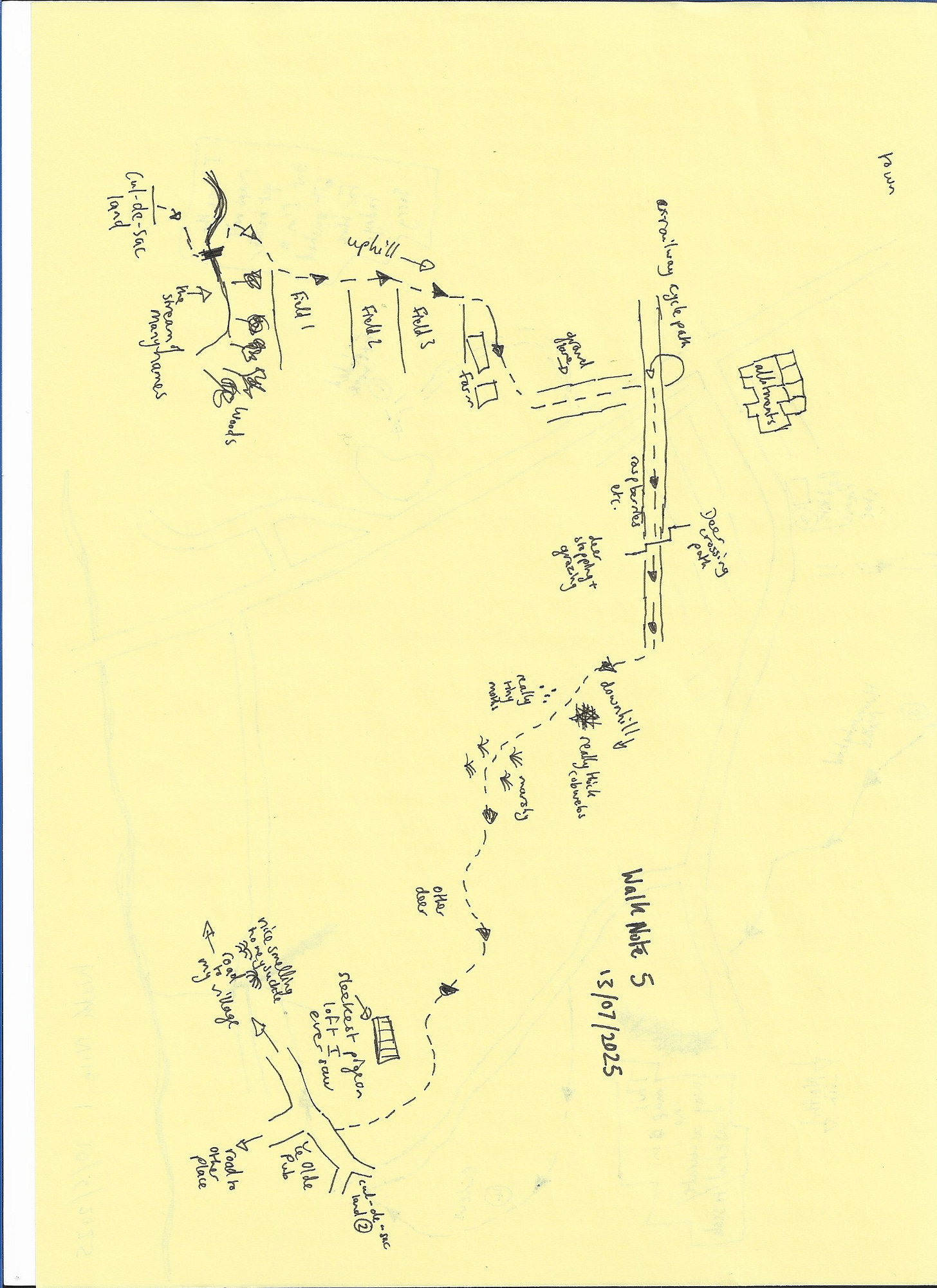 I walk through the sound of nearby allotment chickens and the patter of the dew dropping down the leaves of the larger trees on the higher side of the line.